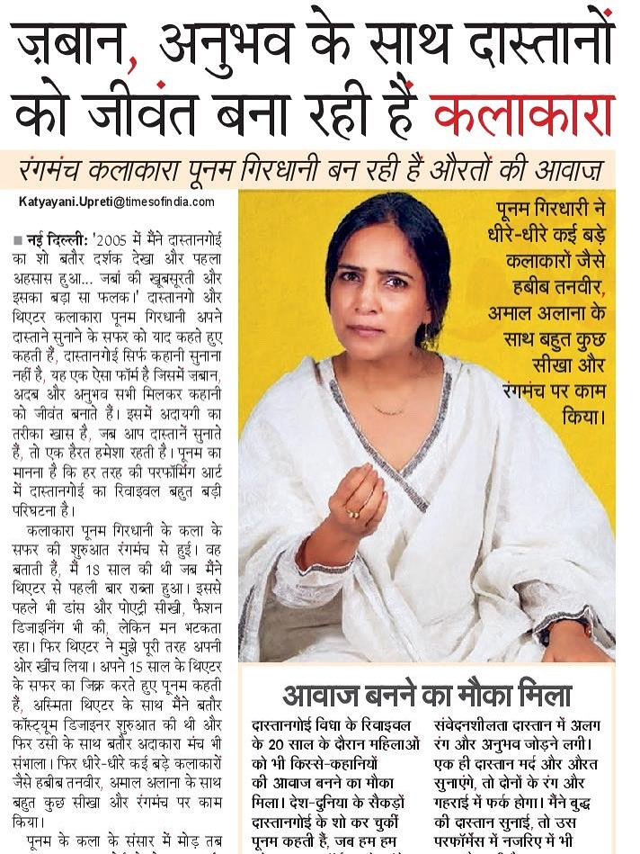कलाकारा पूनम गिरधानी के कला के सफर की शुरुआत रंगमंच से हुई। वह बताती है, मैं 18 साल की थी जब मैंने थिएटर से पहली बार राब्ता हुआ। |