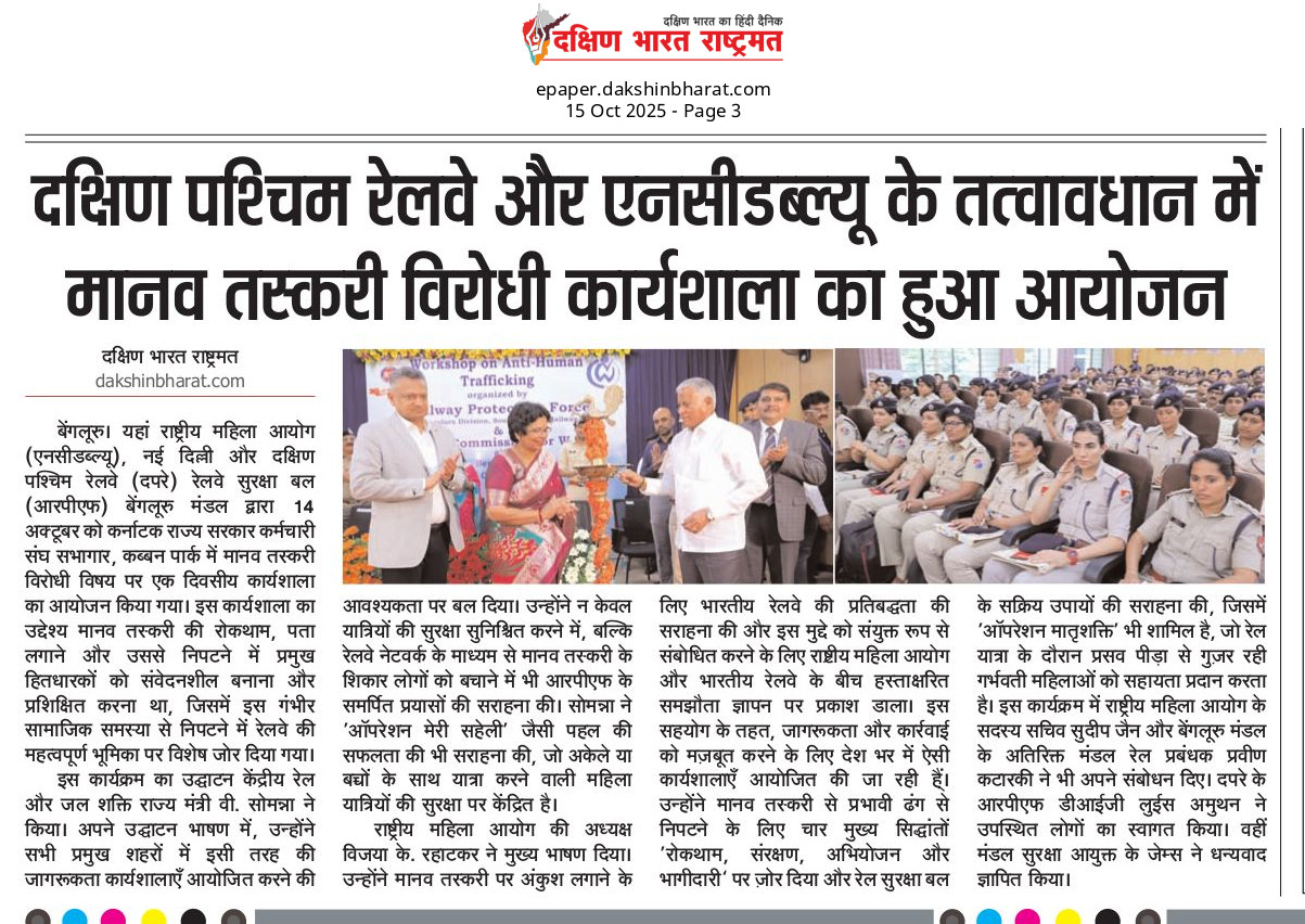दक्षिण पश्चिम रेलवे और एनसीडब्लू के तत्वधान मे मानव तस्करी विरोधी कार्यशाला का हुआ आयोजन :- दक्षिण भारत राष्ट्रमत |
